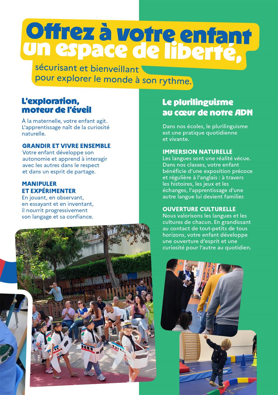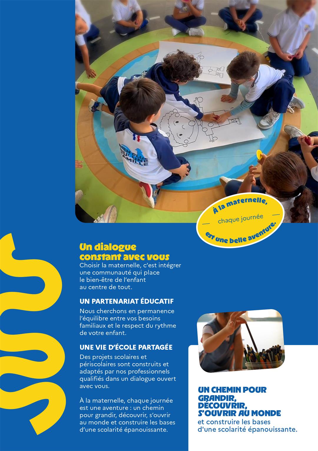 L'école maternelle est une école de l'épanouissement et du langage. Sa mission principale est de donner envie aux enfants d'aller à l'école pour apprendre, s'épanouir et affirmer leur personnalité. Ces premières années de scolarisation établissent les fondements éducatifs et pédagogiques sur lesquels s'appuient et se développent les apprentissages des élèves pour l'ensemble de leur scolarité. |
